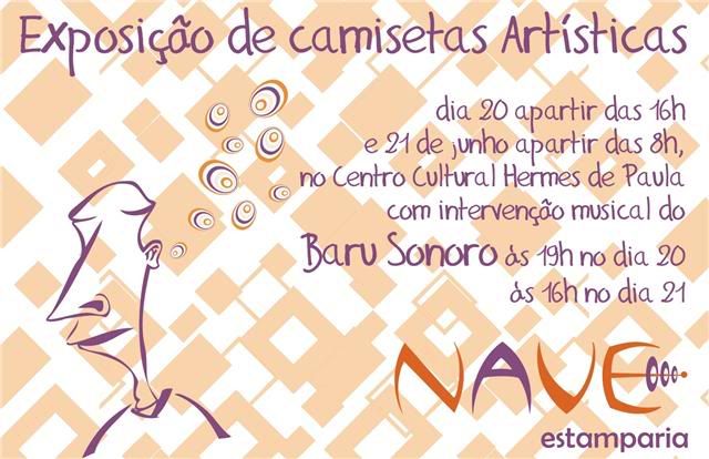 A Nave Estamparia lançou sua primeira coleção de camisetas artísticas e de blusas para cursos no Centro Cultural Hermes de Paula nos dias 20 e 21 de junho. O evento contou com um grande público e com o show do Barú Sonoro e de intervenção teatral de Patrícia Giseli e Auiri. Convite para a Exposição